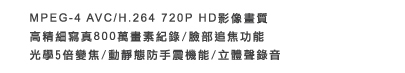 SANYO VPC-HD800 使用先進MPEG-4 AVC / H.264 720p。壓縮格式增長了攝影時間,且能真實呈現高畫質影像。